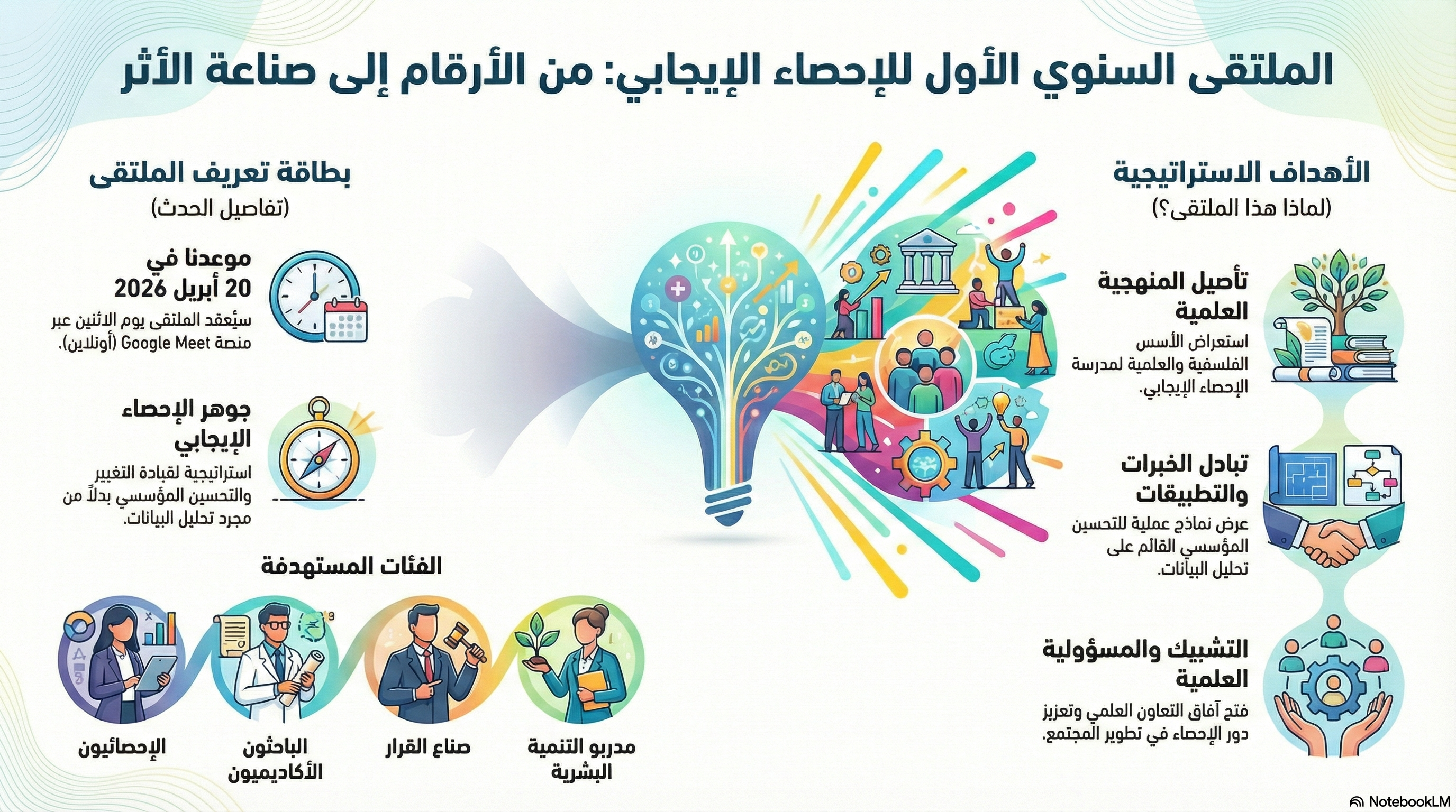 في العشرين من نيسان/أبريل، نحتفي بذكرى انطلاق "الإحصاء الإيجابي" كمنهجية علمية تسعى لتطوير الفكر الإحصائي والانتقال به من حيز الرصد والوصف إلى فضاء البناء والتحسين المؤسسي.تخليداً لهذه المحطة المعرفية، تُعلن أكاديمية الإحصاء الإيجابي عن إقامة ملتقاها السنوي الأول (أونلاين)، ليكون منصة تجمع الباحثين، القادة، والمستشارين المهتمين بتطوير الأدوات الإحصائية برؤية إيجابية وتنموية.